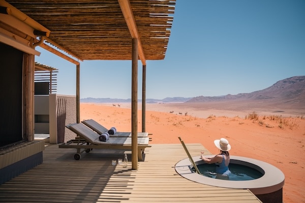In cima ad una duna rossa. In mezzo alla savana senza strade. A picco su un fiume con gli ippopotami sotto. Lodges che esistono dove nessuno avrebbe immaginato di costruire.